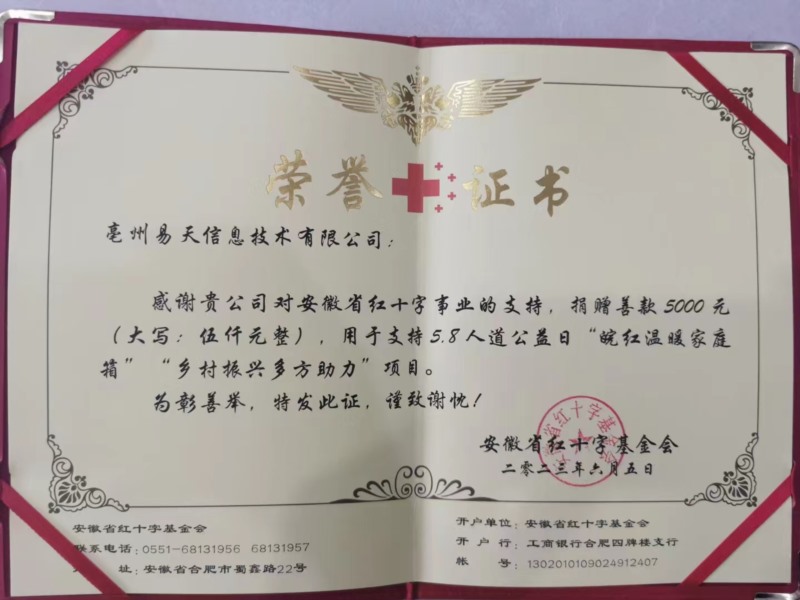 作為一家具有社會責任感的企業(yè),亳州易天科技一直致力于公益事業(yè),積極回饋社會。此次捐款不僅體現(xiàn)了對公益事業(yè)的支持和關(guān)注,也體現(xiàn)了其對社會責任的承擔。