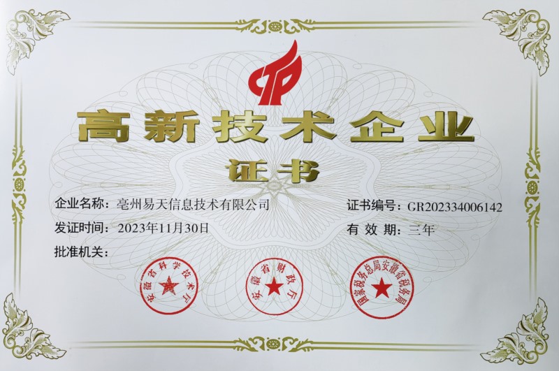 高新技術(shù)企業(yè)證書是對(duì)企業(yè)在技術(shù)研發(fā)、產(chǎn)品創(chuàng)新、市場(chǎng)競(jìng)爭(zhēng)力等方面綜合實(shí)力的權(quán)威評(píng)價(jià)。獲得這一證書,不僅意味著亳州易天科技在技術(shù)研發(fā)和創(chuàng)新方面取得了顯著成就,還代表著公司在推動(dòng)行業(yè)技術(shù)進(jìn)步、促進(jìn)地方經(jīng)濟(jì)發(fā)展等方面做出了積極貢獻(xiàn)。